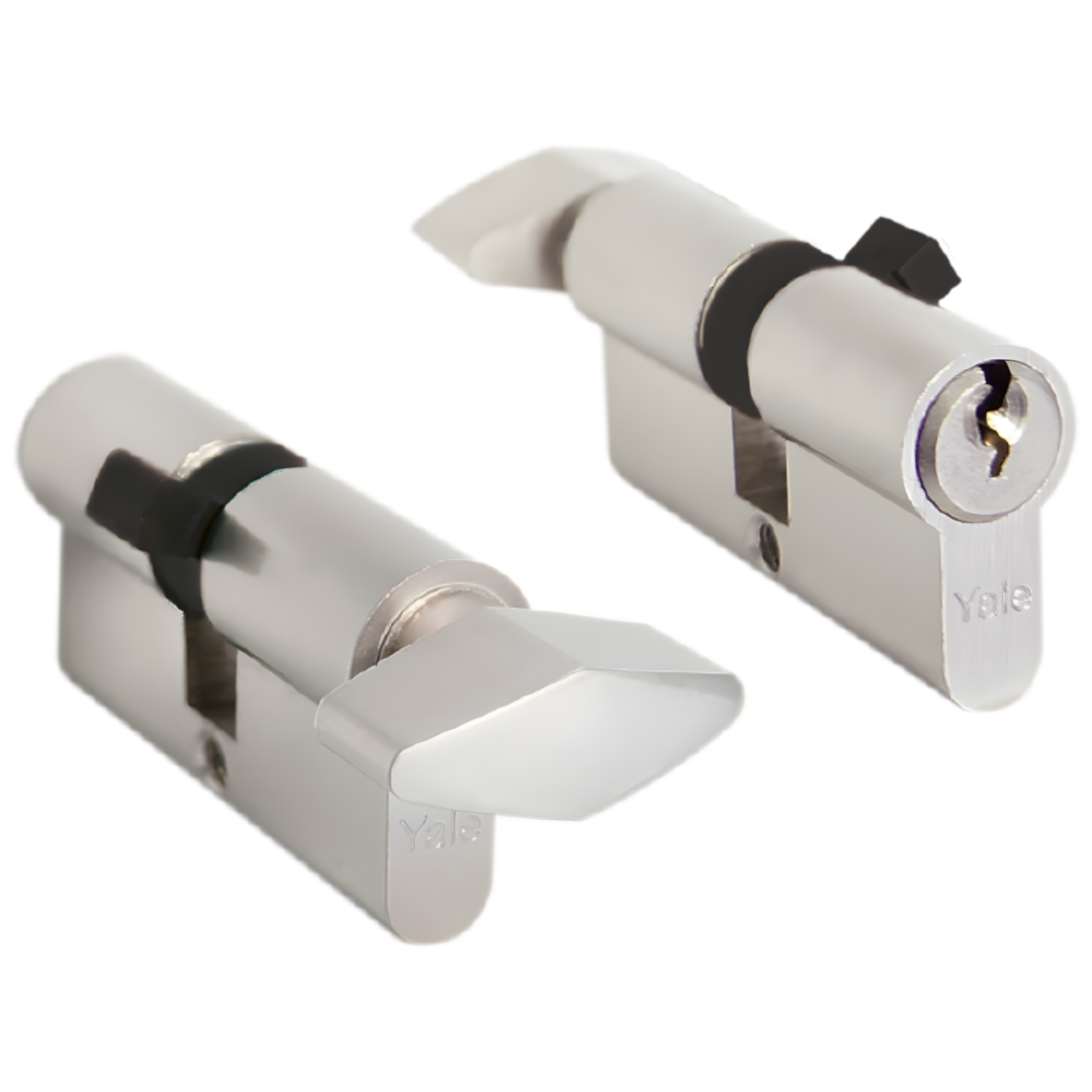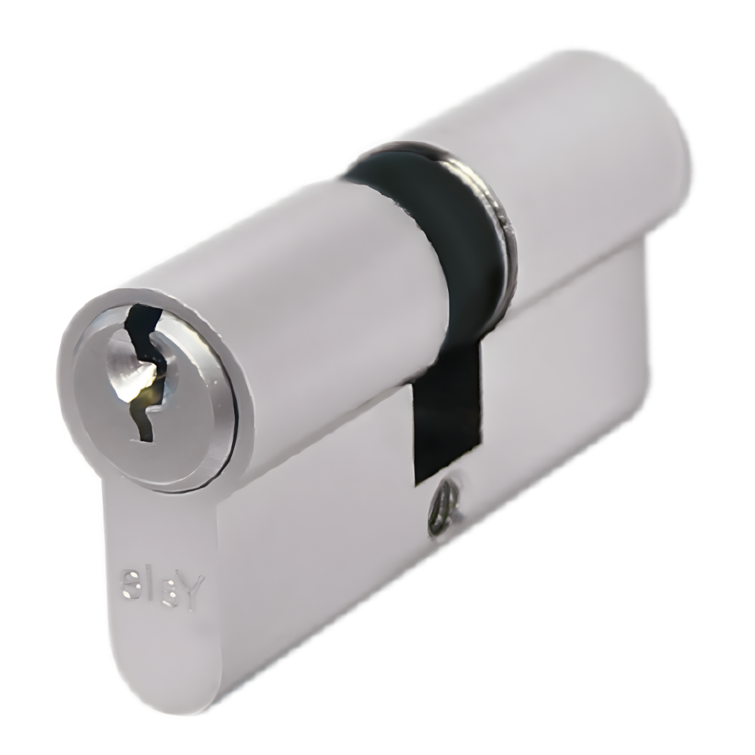 Cilindro de seguridad estándar. Triple protección anti–taladro, perno frontal acerado, placa frontal en acero, perno frontal en acero, barra lateral anti–bumping, tarjeta para copia de llaves originales, sistema anti–extracción.